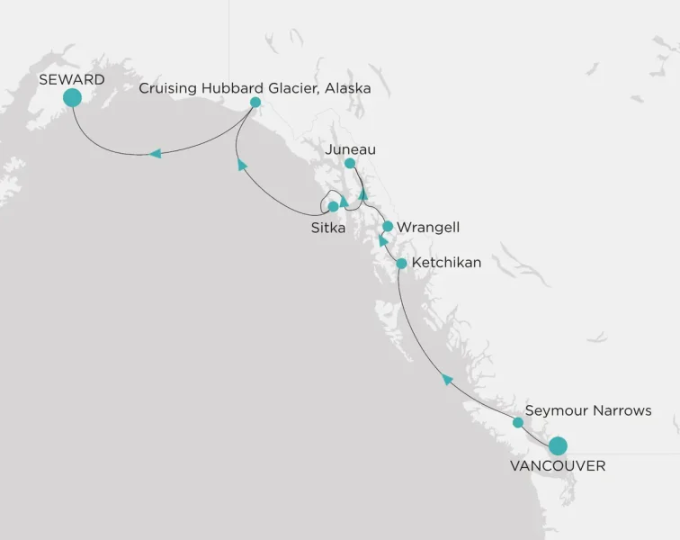 This northbound route from Vancouver, Canada up to Seward, Alaska, takes you via the Icy Strait for high-octane thrills. Highlights include sailing through the awe-inspiring Seymour Narrows; hopping off in Alaska’s cultural capital of Juneau; and the historic towns of Ketchikan, Wrangell and Sitka, set amid the natural splendor of mountains and glaciers. You can also witness the spectacle of the Hubbard Glacier up close as we slowly cruise past before arriving at our final stop, Seward.