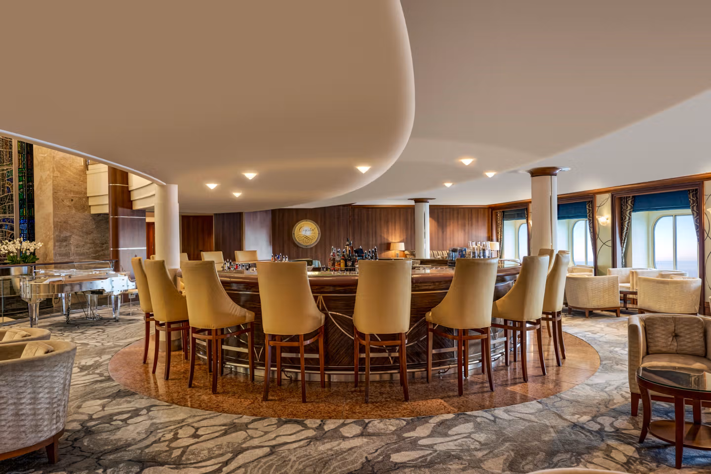 Buffet style dining wrapped in floor to ceiling windows and a chic open air dining area. This venue offers breakfast and lunch with a variety of choices from appetizers to desserts. Itinerary driven food selections keep the menu’s fresh, while carving stations and individual a la minute cooking add a dynamic element. Open seating.