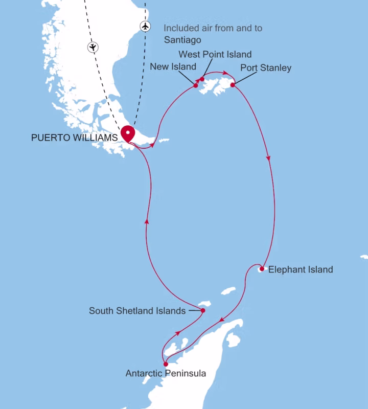 Pre-night hotel stay and charter flights included with sailings from Puerto Williams. Explore the wild southern frontiers — from the Falklands to Antarctica’s spellbinding landscapes.