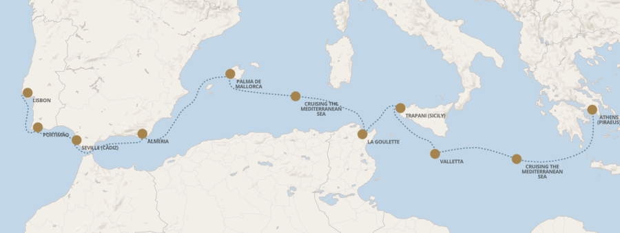Set sail on a spectacular Mediterranean voyage that takes you from the ancient wonders of Athens to the elegant shores of Lisbon. Discover the baroque charm of Valletta, the historic beauty of Sicily’s hilltop towns, and the vibrant culture of Palma de Mallorca. Stroll through the whitewashed villages of Tunisia and soak up the coastal charm of Portugal’s Algarve. With a thoughtfully curated selection of ports, this journey offers the perfect mix of cultural discovery and Mediterranean allure.