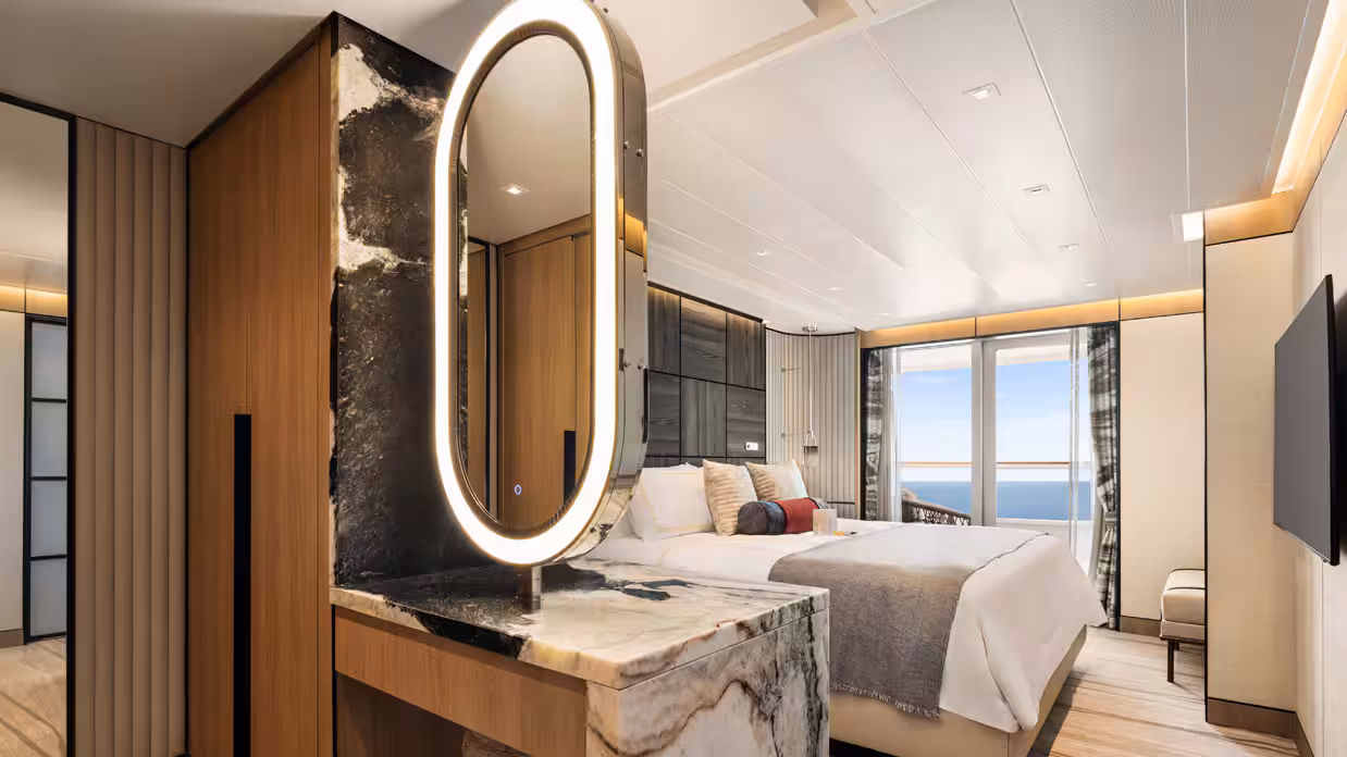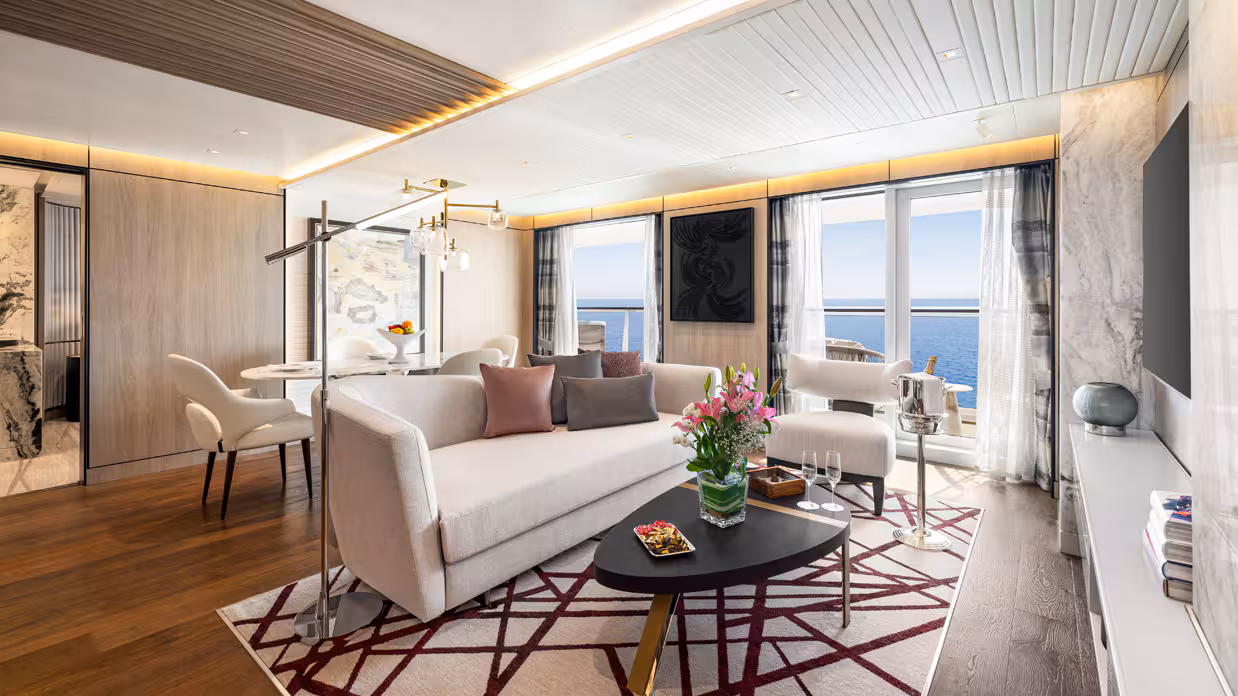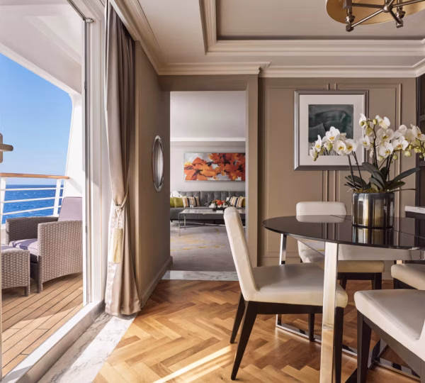 Our largest suite, available in 2023 or 2020 designs, offers two walk-in wardrobes, separate living and dining areas with panoramic ocean views, a study, and a custom built-in bar. There is also a Jacuzzi bathtub with ocean views, separate shower, bidet, and guest bathroom. Enjoy unlimited dining at specialty restaurants, unlimited laundry services, and more.