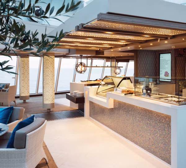 Buffet style dining wrapped in floor to ceiling windows and a chic open air dining area. This venue offers breakfast and lunch with a variety of choices from appetizers to desserts. Itinerary driven food selections keep the menu’s fresh, while carving stations and individual a la minute cooking add a dynamic element. Open seating.