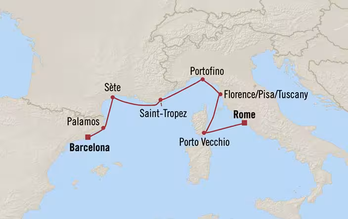 Sail from Barcelona to Rome on an unforgettable 8-day journey through the heart of the Mediterranean. Discover Gaudí’s masterpieces in Barcelona, the seaside charm of Palamós, and the art and lavender fields of Provence. Stroll the glamorous boulevards of Cannes and Saint-Tropez, then cross into Italy to admire the Renaissance splendor of Florence, the beauty of Tuscany, and the coastal allure of Piombino. Conclude your voyage in Rome, where ancient history and timeless elegance create the perfect finale to this spectacular Mediterranean adventure.