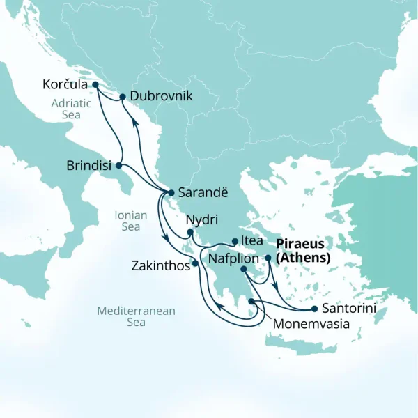 This 14-night Seabourn luxury voyage round-trip from Athens blends the timeless beauty of the Greek Isles with the dramatic Adriatic coast. Explore Santorini’s iconic cliffs, the medieval charm of Monemvasia, and Delphi’s ancient treasures from Itea, before sailing to the Ionian gem of Nydri. Discover the rising allure of Sarandë in Albania, then immerse yourself in the grandeur of Dubrovnik and Korcula and more. With extended port stays, all-suite accommodations, fine dining, and Seabourn’s signature all-inclusive elegance, this itinerary offers an indulgent journey through some of Europe’s most enchanting seaside destinations.