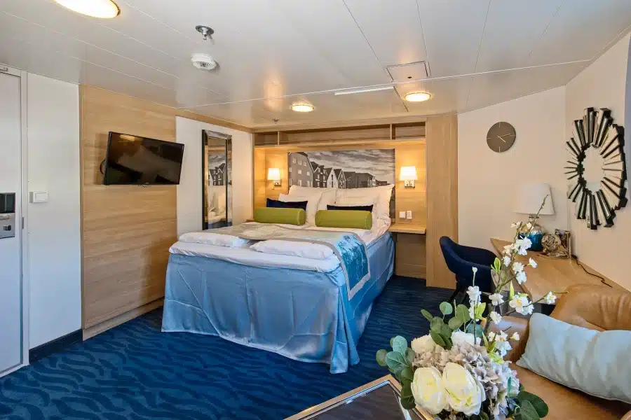 These elegant suites on the upper deck, accommodating up to 4 people, feature a separate bedroom, a seating area with a sofa bed and 2 chairs, a TV, minibar, hairdryer, coffee and tea facilities, and Wi-Fi.