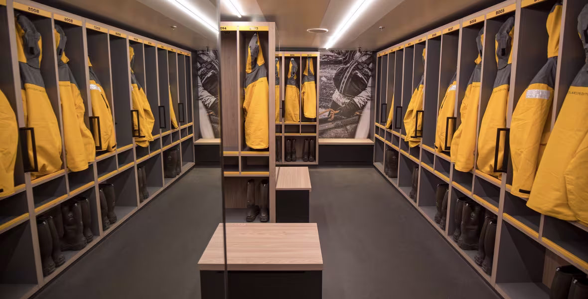 The Ready Rooms on Deck 2 offer an open storage locker for each person on board, where you can store and dry your gear between excursions. Enjoy ample space and plenty of benches to help you gear up to embark on the Zodiacs.