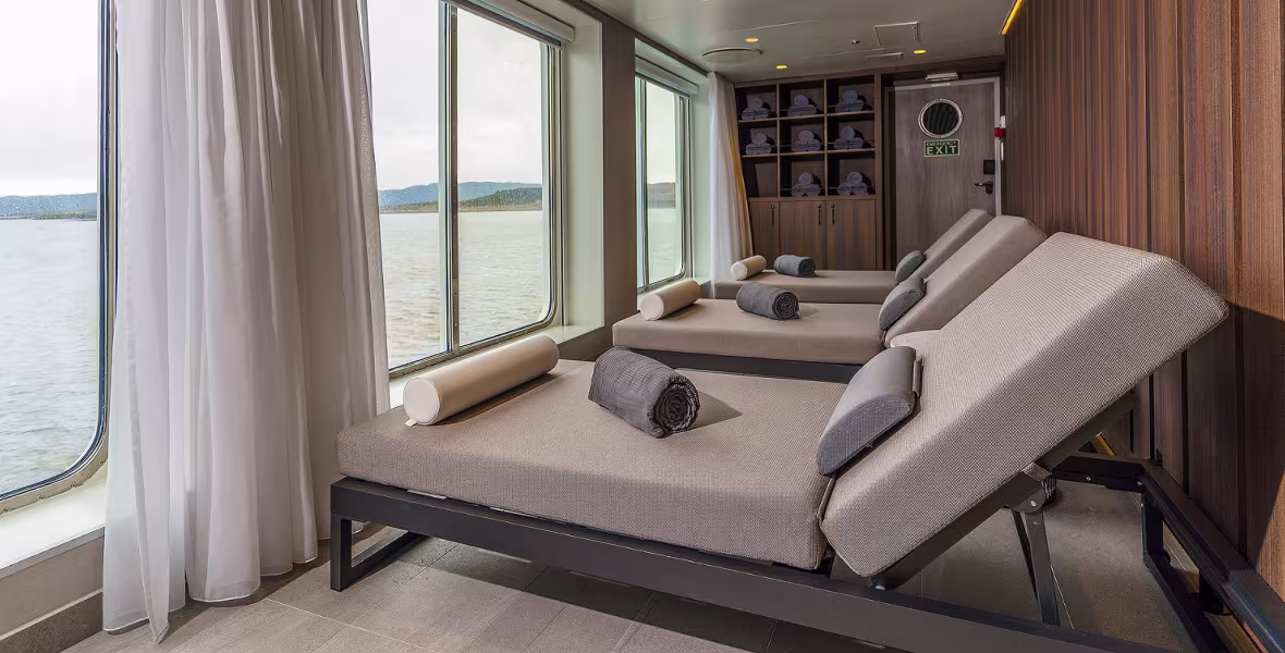 The Tundra spa is located on Deck 7, where you can take advantage of the services offered in calming spaces with panoramic views. Spa treatments and massages are bookable on board. The steam room is available for you to relax and rejuvenate after a hike or a workout. The sauna provides ample space to warm up with views to the icy waters of the Polar Regions. Bring your bathing suit so you can join us in the Polar Plunge, or to use the sauna or steam room. You might also appreciate having some waterproof shoes. It is recommended to wear closed-toed shoes while moving around the ship, but as long as your water shoes have a heel strap and fit securely, they can be