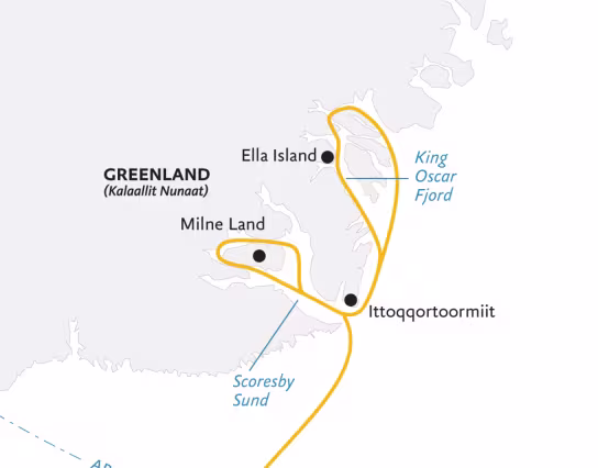 During your tour of Greenland’s remote northeast coast, you’ll enjoy Zodiac cruises and shore visits to several locations. We’ll also keep an eye out for grazing muskoxen, as 40 percent of the world’s population lives in Northeast Greenland National Park. Sailing through spectacular Scoresby Sund, the birthplace of many icebergs, you’ll immediately see why some say it’s the most beautiful fjord system on the planet. Sites such as Frederiksdal and Sydkap offer opportunities to explore the colorful tundra and the remains of ancient Thule settlements. At the entrance of the sound is East Greenland’s most northerly community, Ittoqqortoormiit, where you may spend time interacting with the Inuit people and learning about their way of life. You may also have a chance to see the northern lights here if the skies are clear. Deeper in the sound, Røde Ø offers a picturesque locale for admiring the beauty of sky-blue bergs set against striking red sandstone cliffs. Magnificent vistas also await at Kong Oscar Fjord, with possible landings at Ella Ø, renowned for its rugged cliffs and ice-choked waters, and flower-rich Botanikerbugt, on Ymer Ø.