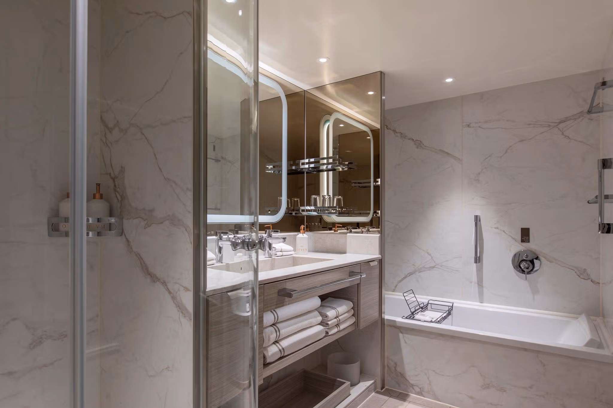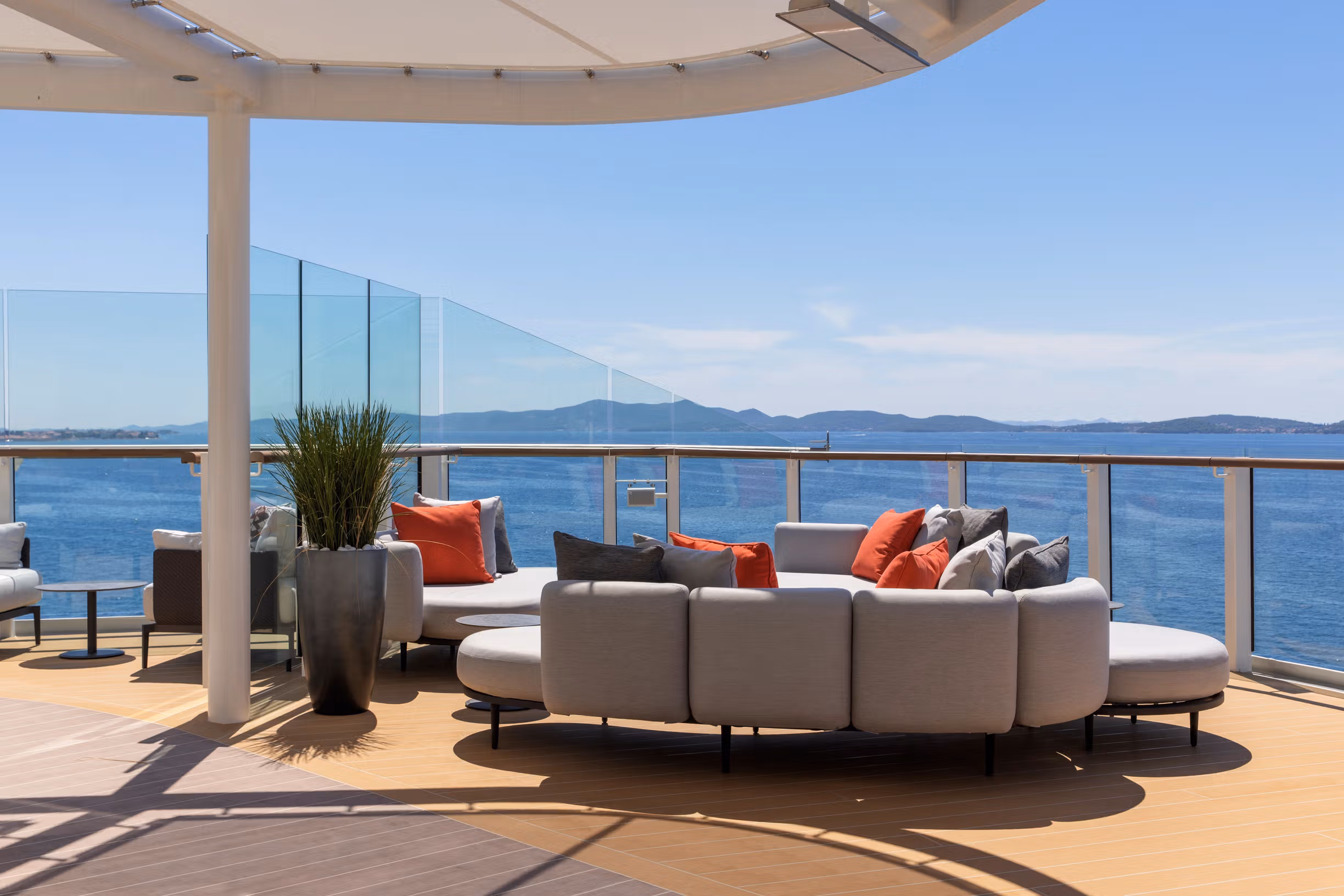 The Otium Suite is one of our newest and finest suites. Located in the premium aft corner position, the Otium Suite has a total size of 123 m2 (1,324 sq ft), including a 40 m2 (431 sq ft) balcony, which comes complete with a whirlpool. Features include a spacious living room area, a luxurious walk-in closet, a separate large bedroom, plus a bathroom with a whirlpool bath and walk-in shower. The crowning glory of the Otium Suite, however, is surely its unprecedented 270-degree view, giving you some of the best possible views of your destination.