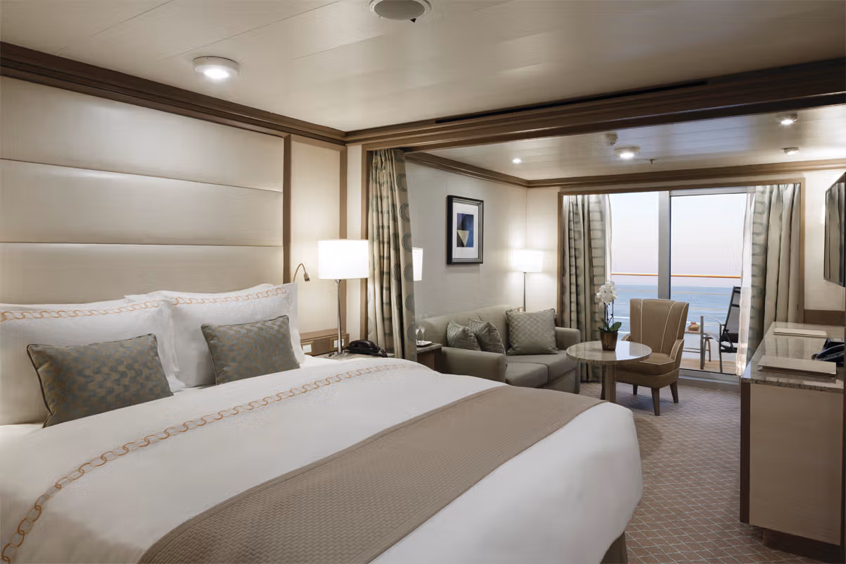 Well situated at the front and back of the ship, the 28-m2 (301-sq-ft) interior of the Veranda Suite is only the beginning. The 5-m2 (54-sq-ft) teak balcony makes each spectacular sunset feel like it is yours alone. From beautiful bed linens to sumptuous furniture, our Superior Veranda Suites are luxurious inside and out! Whether enjoying some down time with the state-of-the-art entertainment system or taking in dinner in-suite, the Superior Veranda is the coziest home away from home on the high seas.