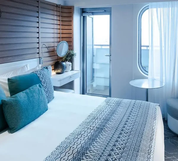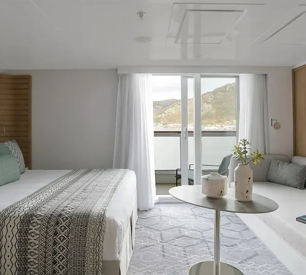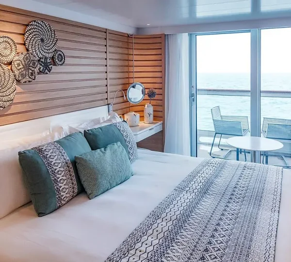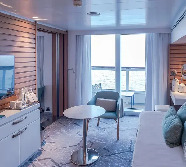 Suites on Decks 3, 4, and 6 have a private 64 ft² balcony with two armchairs; suites on Deck 5 have a private 64 ft² balcony with two armchairs