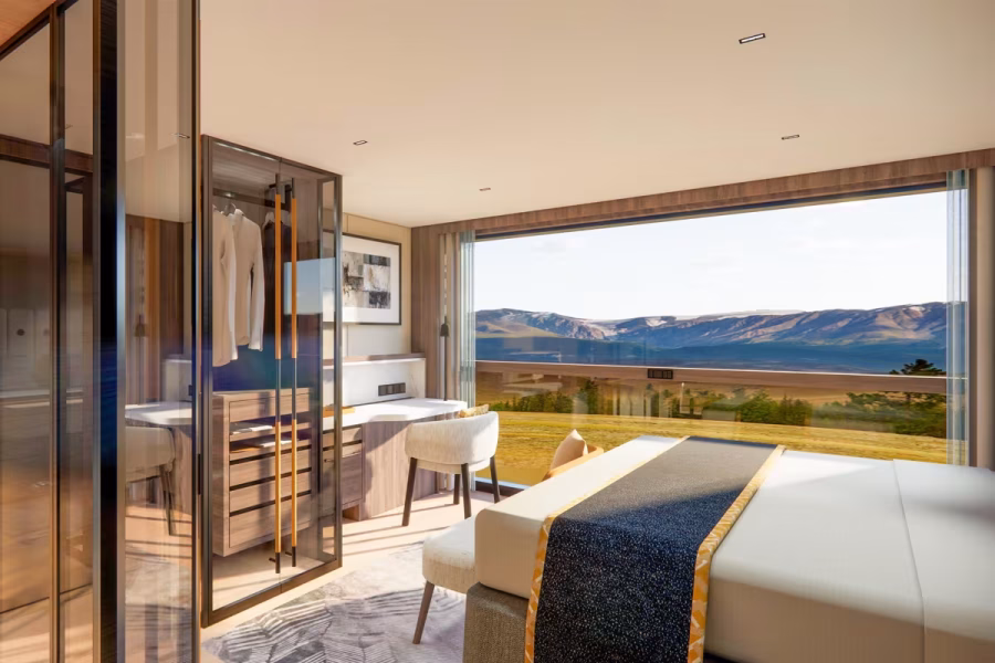 These 210-square-foot cabins located at the back of the Main Deck feature floor-to-ceiling windows, sash window balcony and quiet sleep sound cancellation system. The cabins each have a European king bed or two twin beds (configured upon request), a 55-inch smart TV, desk and chair, minibar, individual climate control, mini library and ample storage including two wardrobes. Amenities include Wi-Fi, unlimited tea/coffee, bathrobe and slippers, hair dryer and sustainable bath products in the ensuite bathroom.