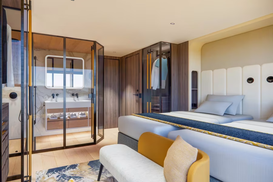 These spacious two-bedroom family suites are located at the back of the Main Deck and offer 420 square feet of well-appointed living space. Each bedroom features floor-to-ceiling windows, sash window balconies, and a quiet sleep sound cancellation system for maximum comfort. Bedrooms include a European king bed or two twin beds (configured upon request), a 55-inch smart TV, desk and chair, minibar, individual climate control, mini library, and ample storage with four wardrobes. The ensuite bathroom is equipped with sustainable bath products, a hair dryer, bathrobe and slippers. Complimentary Wi-Fi and unlimited tea/coffee are included.
