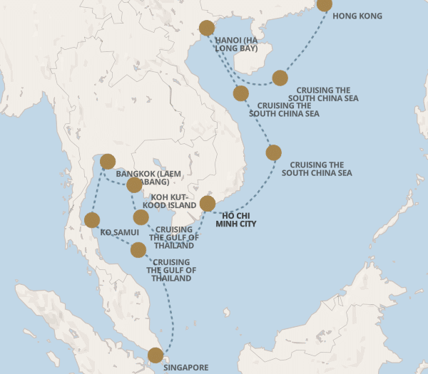 Sail through the heart of Southeast Asia on this 12-night luxury cruise from Singapore to Hong Kong aboard Regent’s Seven Seas Navigator. Beginning in the vibrant city of Singapore, this refined journey explores Thailand and Vietnam, blending tropical coastlines, historic cities, and cultural highlights. Discover the beaches of Ko Samui, enjoy extended time in Bangkok, and immerse yourself in Vietnam’s rich heritage with calls in Ho Chi Minh City and the breathtaking scenery of Ha Long Bay, before arriving in dynamic Hong Kong.