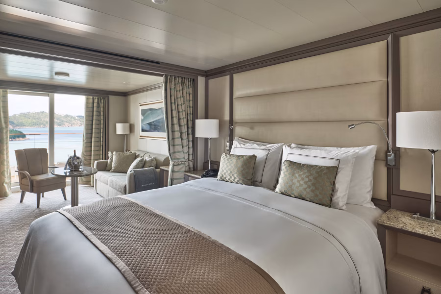 Available in a one- or two-bedroom configuration (so perfect for families), the Owner’s suite is the epitome of elegance at sea. A large seating area is the hub of the suite, equipped with all modern conveniences—think a Bose sound system, an interactive 55″ TV, and even an Illy coffee machine! Whether you are inside or relaxing on the large teak veranda, the Owner’s suite offers supreme comfort every hour of the day!