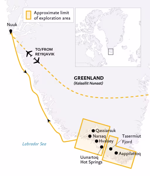 You’ll transit through the scenic 105-kilometer long Prins Christian Sund Fjord (Ikerasassuaq), and explore the dramatic fjords of South Greenland. Our team has planned a visit to the village of Aappilattoq, where you can experience local culture, music, and traditional foods. The journey continues to the steep-walled 70-kilometer Tasermiut Fjord, known as Arctic Patagonia, where overnight camping and various excursions are available amidst stunning glaciers and peaks. The maze of fjords, sounds, islets, inlets and skerries (rocky islands) in and around Cape Farewell (Nunap Isua) at Greenland’s most southern tip reveals a magic found nowhere else.
