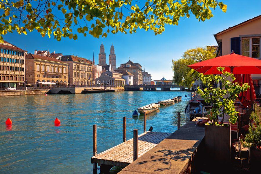 Zurich waterfront landmarks autumn colorful view, largest city in Switzerland