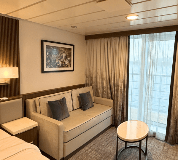 We stayed in a Balcony Stateroom Category A located on the starboard side of the ship on level four. The room was reasonably spacious, with modern furniture and sleek decor reflecting the polar regions. There was plenty of storage space for all the coats, jackets, pants and layers that we brought (and I’m a chronic overpacker) so it was really great to see. Another bit of brilliance was the bed! It was two beds put together, and I often find they normally end up having an uncomfortable gap in the middle. But this was totally different! It was soft and spacious, with a really warm comforter and blankets. It was also nice to have a separate seating area with a couch, alongside a coffee table and vanity/desk area.