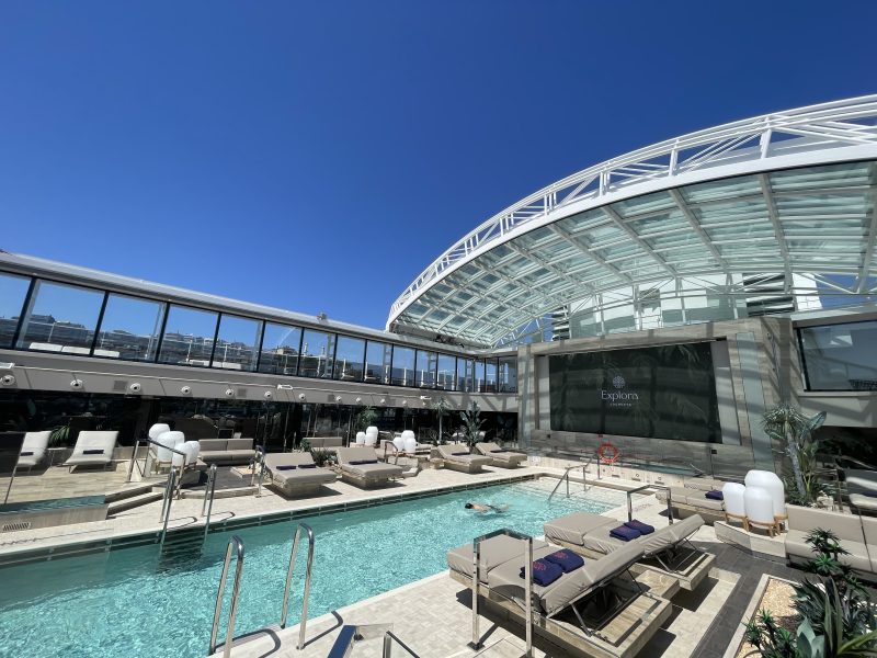 Facilities and amenities onboard Explora Journeys were top-notch. There were plenty of pools onboard which were of course a necessity in the hot Mediterranean sun. The Main Pool was perfect if you wanted to actually swim but there were also three smaller pools to lounge around in. Plus, plenty of hot tubs which I didn’t try out because the weather was too warm. A good thing to note is that two of these pools are adults only. Having said that, there were not too many children onboard, and they were mostly older teenagers.